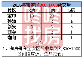宝安区800-1000万成交量的数据,我们统计到的量未72套。宝中45套,碧海8套,新安15套,西乡3套,翻身1套。3房和4房的选择上,宝中区域成为主流的选择。对比其他片区,拉开较大的差距。