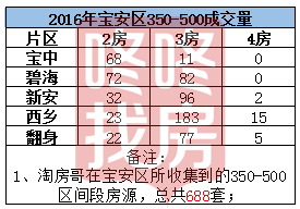 350-500万价格区间段,我们统计到的数据是688套。宝中79套,碧海154套,新安130套,西乡221套,翻身104套。这个价位段,西乡区域3房成交最为活跃,2房主要活跃分布在宝中和碧海。