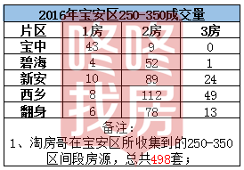 250-350万区间段我们统计到的数据为498套。其中,宝中52套,碧海56套,新安123套,西乡169套,翻身97套。其中2房成交最活跃的分布在西乡片区,1房主要分布在宝中。
