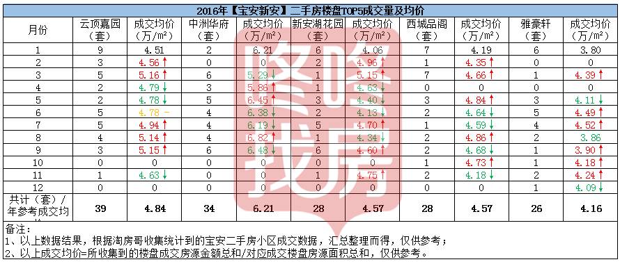 新闻提要 数据来源于2016年所收集到的宝安各区成交房源,以全年五个成交较为活跃的片区作为参考依据,总计2181套(未含福永、沙井、松岗、石岩)。我们统计到的西乡二手房成交数据190套中,成交TOP5楼盘分别是:桃源居190套,天骄世家38套,港隆城34套,领航城30套,兴达华府16套,仅供参考。