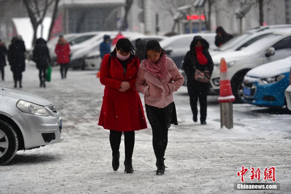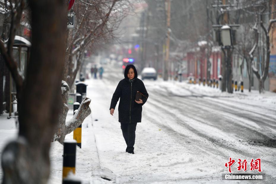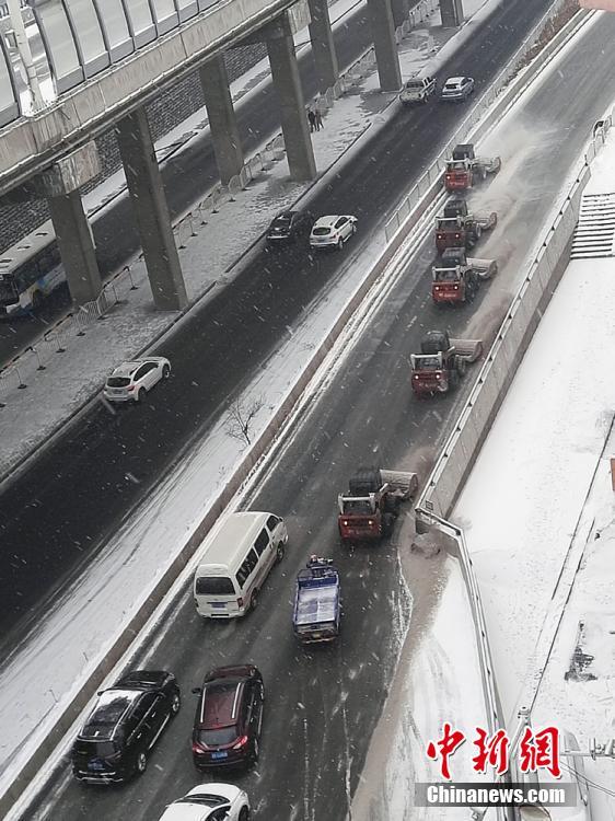 道路上车辆缓慢行进,城市建筑物已被积雪覆盖。刘新 摄