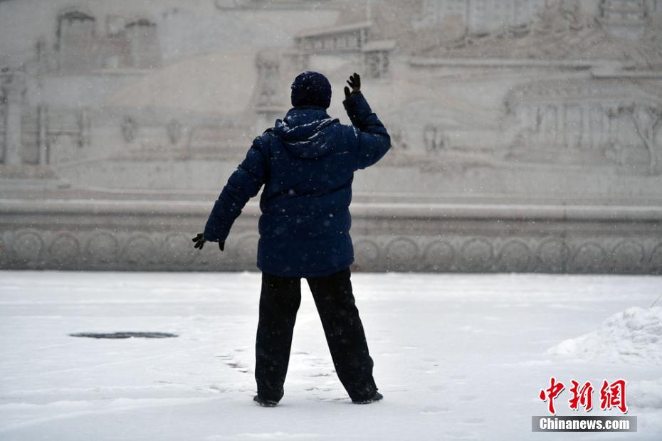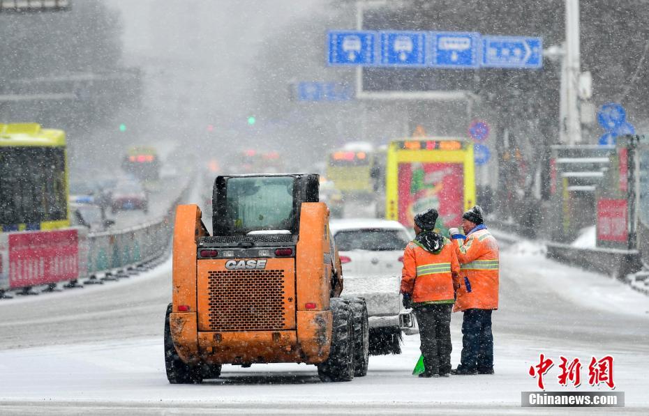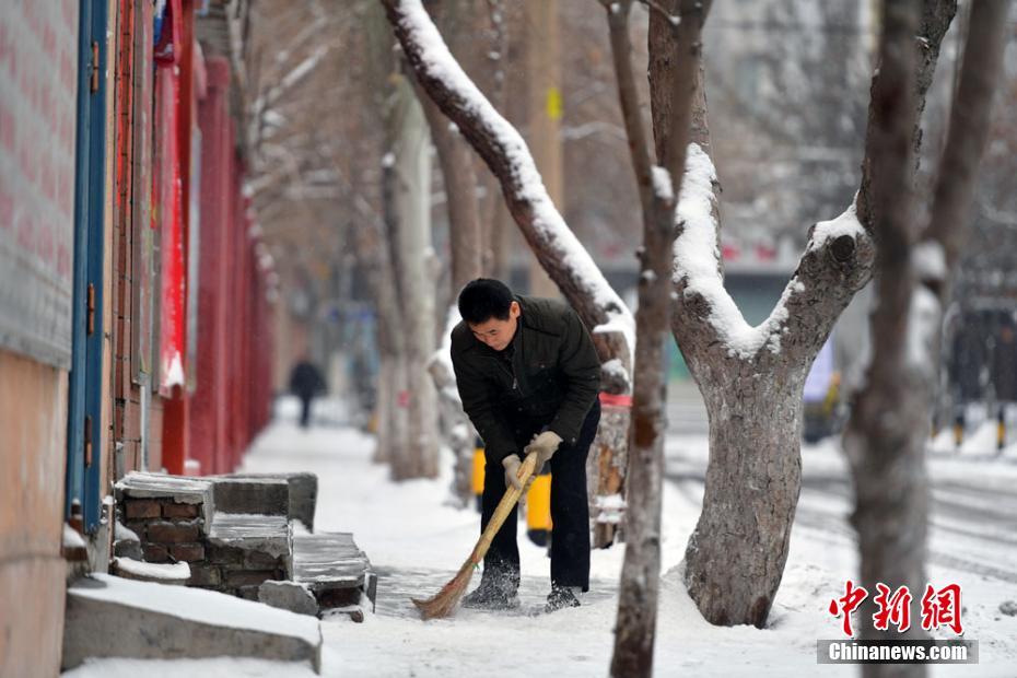 大雪天气中,环卫工人随时清理积雪。刘新 摄