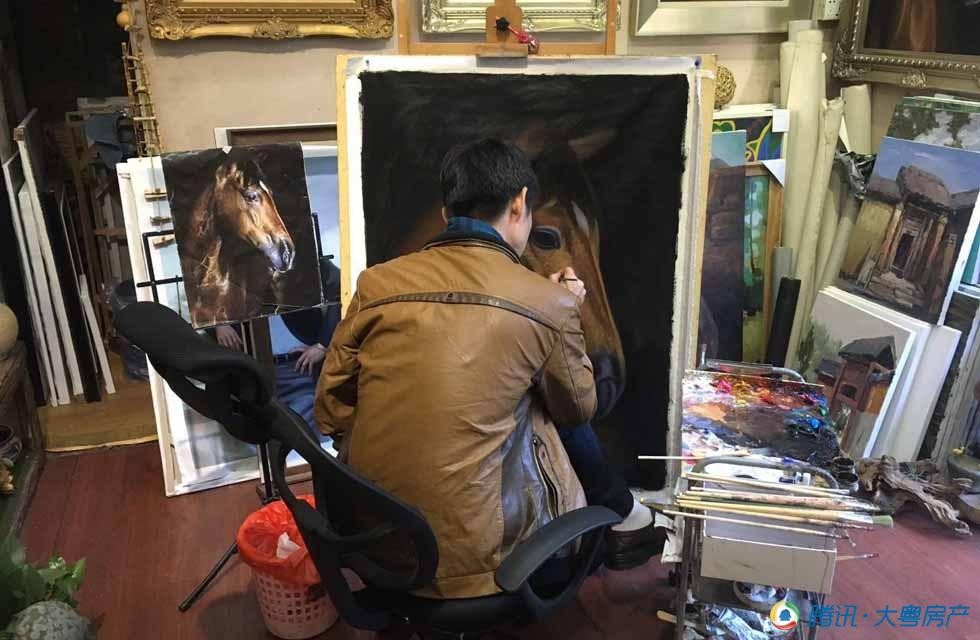 像这种技艺比较精细的画幅就要贵上许多,一幅3000元左右,这位正在一笔一笔描骏马脸上鬃毛的画工说,他花一幅这样的油画大概需要10天。