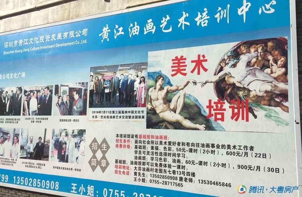 自此,黄江被称为油画村第一人,直到现在,从一进门就能看到的黄江油画艺术广场,再到墙面上打着的黄江油画艺术培训中心广告,大芬油画村到处仍有黄江的影子。