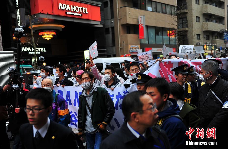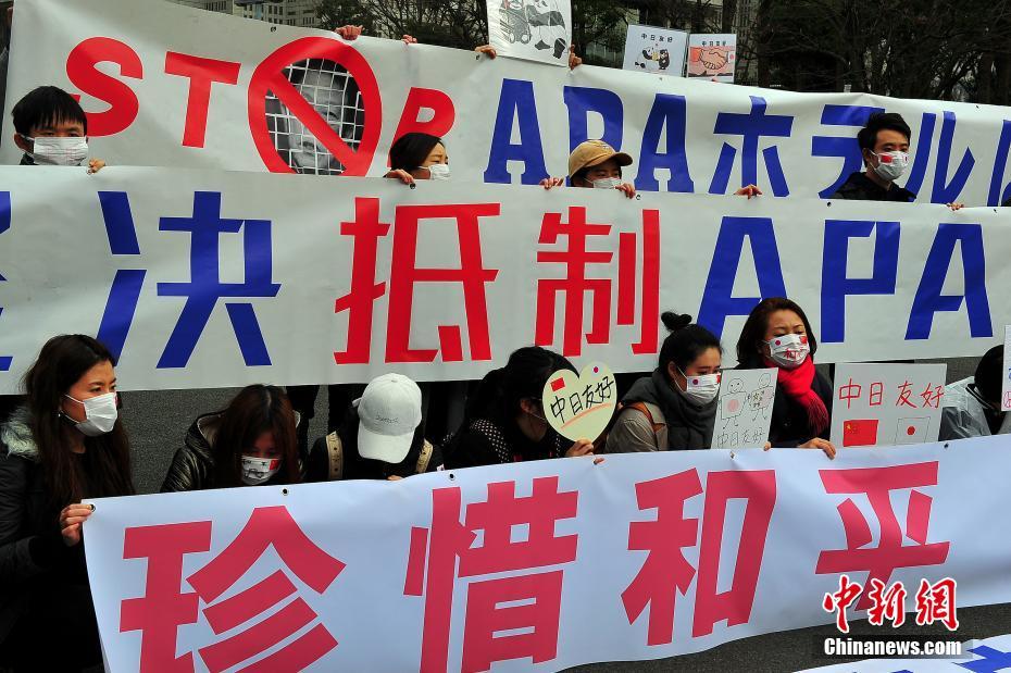 2月5日下午,近百名在日华侨华人和中国留学生在东京举行了抗议APA酒店的和平游行活动,抗议APA酒店长期在所有客房中放置由该集团老板元谷外志雄撰写的否认、歪曲历史的右翼书籍。