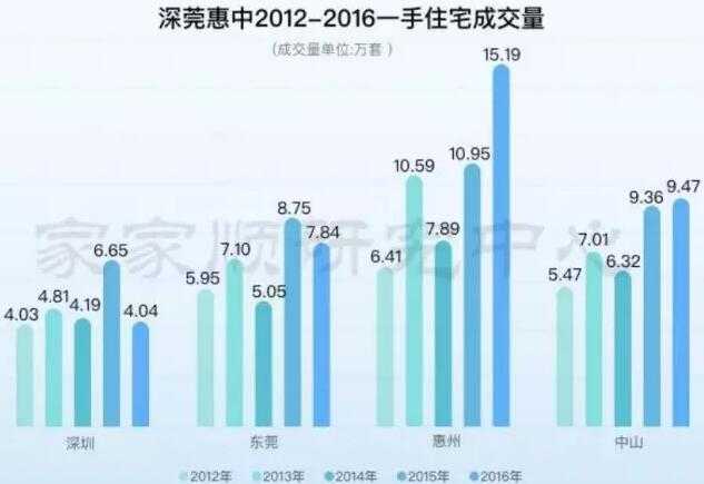 对比2014年,2016年惠州一手住宅成交量直接翻倍,与同为临深城市的东莞、中山相比,惠州也遥遥领先。 深圳过去3年的一手住宅总量还不及惠州2016年的全年成交。
