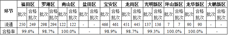这次抽检的商场超市、农批农贸市场、食品批发行共228家,抽检的调味品、蔬菜制品、肉与肉制品、食用油、大米、乳与乳制品、面及面制品、豆制品、饮用水及饮料共 1821批次;合格率100%的区有三个:南山区、坪山区、龙华区。