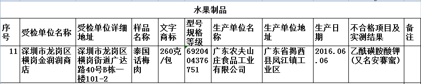 横岗金润润商店的泰国话梅肉检出安赛蜜超标。
