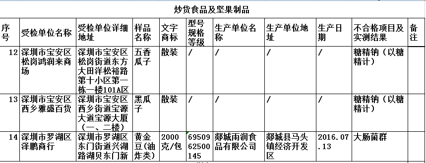 松岗鸿润来商场的五香瓜子、西乡雅盛百货的黑瓜子、罗湖区泽鹏商行的黄金豆检出糖精钠、大肠菌群超标。