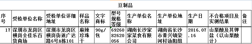 横岗全家乐百货的麻辣珍珠干检出山梨酸及其钾盐超标。