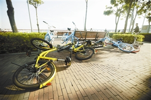 深圳湾公园道路满地倒放的共享单车。