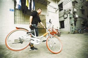 刘智翔正在检查单车上的二维码是否清晰可见。
