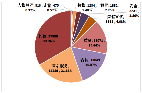 从投诉性质看,2016年受理的投诉中,反映最突出的是售后服务问题,18289宗,占21.88%;其次是合同问题,13849宗,占16.57%;再就是质量问题,13071宗,占15.64%;三大性质类别的投诉比率都超过了10%。虚假宣传问题、安全以及假冒问题,分别有3365宗、3231宗和1882宗,所占比率都低于5%。如图3所示。