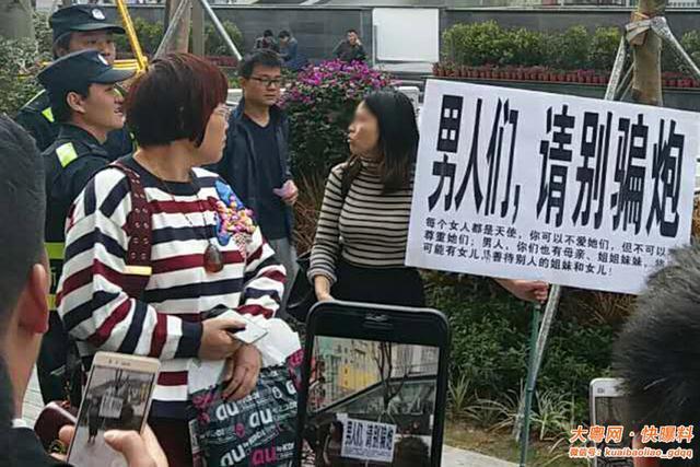 昨天(2月13号)下午4点20分,网友肖先生报料称,下午4点15分在深圳福田区华强北地铁站附近,有一中年女性手举“男人们,请别骗炮”的牌子,引来大量群众围观拍照。