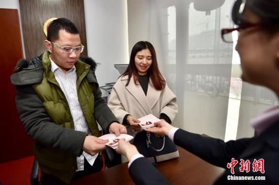 2月14日,一对新人在北京市朝阳区民政局婚姻登记处领取自己的结婚证。中新网记者 金硕 摄