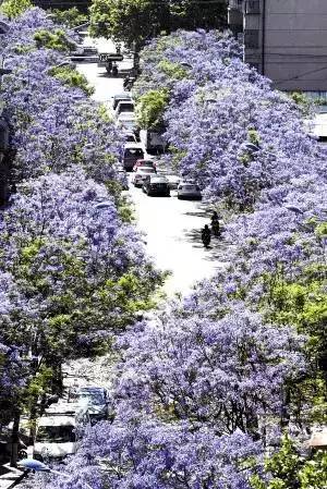 路边盛开的蓝花楹让人以为