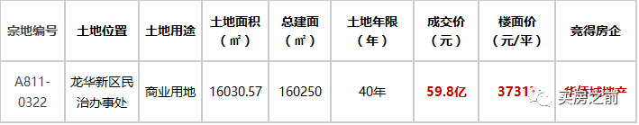 新闻提要 主角是龙华北站商务区的A811-0322宗商业用地,起拍价39.72亿,最终华侨城以总价59.8亿拿下,楼面价37317元/平。这个楼面价 已经超过了去年12月信义玻璃拿下的前海商业地块,当时楼面价为30016元/平,为前海首宗破3万/平的商业用地。