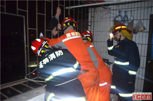 龙东消防中队的消防员李智威告诉记者,2 月 14 日凌晨 2 点左右,深圳市龙岗区植物园路一栋房屋有人报警称屋外有一名形迹可疑的男子,有掉下去的危险。消防队接到警情后赶到事发现场,发现该栋房屋五楼的防盗网外有一名 20 多岁的男子,他攀爬在防盗网上,双手紧紧的拽住生锈的栏杆,身体冻得瑟瑟发抖,而且随时都有掉下去的可能,消防人员立即对该男子开展解救工作。