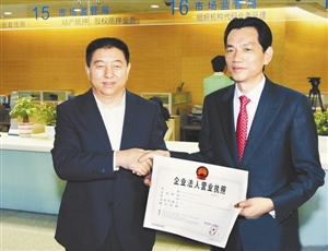 2013年3月1日,国家工商行政管理总局副局长刘玉亭(左)把商事登记制度改革后首张新版营业执照颁发给了深圳市前海富德能源投资控股有限公司。(资料图)