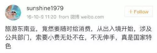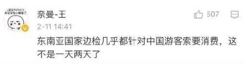 “太多人说去东南亚国家出入境需要被勒索,感觉很多人都默认了这个情况。”一些网友补充表示,“东南亚国家是‘索要小费’现象的‘重灾区’”;“旅游东南亚,从出入境开始,涉及公共部门,索要小费无处不在,真是国家特色。”