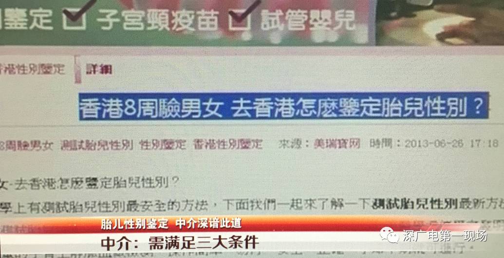 在内地属于非法的胎儿性别鉴定技术,在香港则是合法的,一些非法中介就应运而生了。一家胎儿性别鉴定中介表示,一般怀孕六到七周,准确率百分之九十九点八以上。