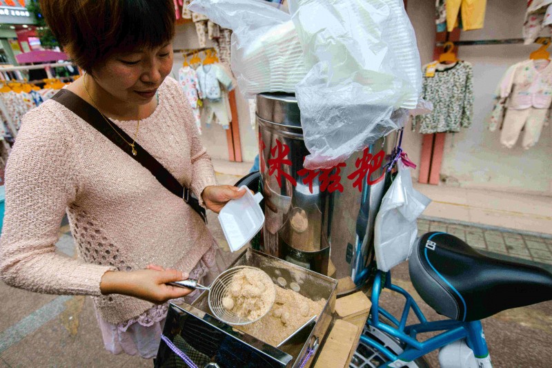 △通往步行街的桥边,卖米糍粑的摊位勾起许多童年回忆