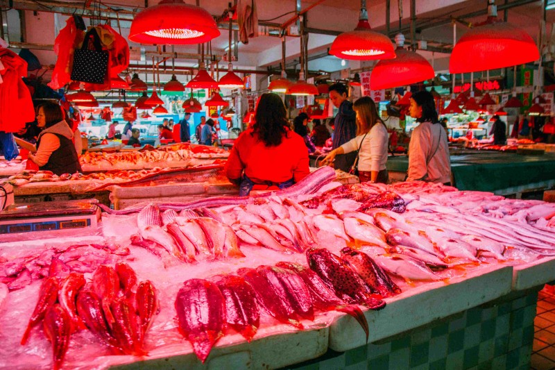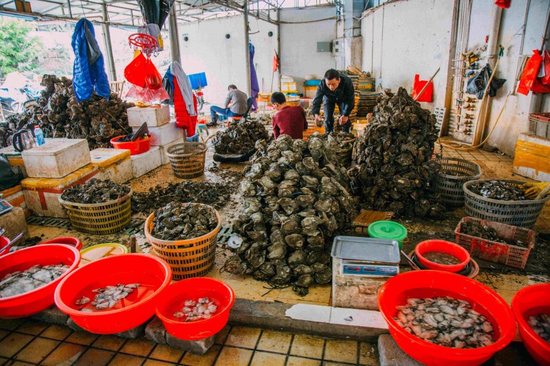 △市场里面的海鲜档,开蚝的时候会招来很多人围观