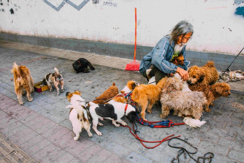 擦肩而过的时候,身后还不断有没栓绳的小狗忠实地追逐他的背影。