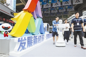 2016年10月12日,全国双创周开幕当天,在深圳主会场主题展示区入口处,参展人员在演示一款机器人展品。(新华社)
