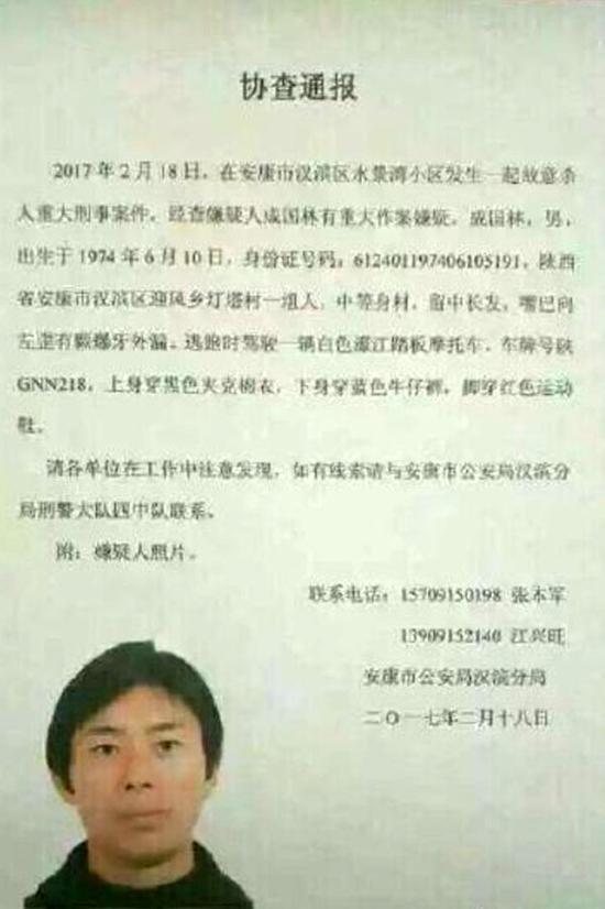 2月18日中午,警方发布协查通报,确定43岁男子成果林有重大作案嫌疑。据遇害者亲属介绍,嫌疑人是屋主胡某姐姐的前夫。
