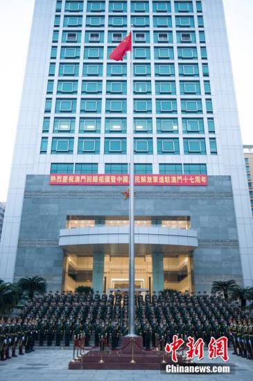 12月20日清晨,中国人民解放军驻澳门部队在澳门新口岸营区举行隆重的升国旗仪式,热烈庆祝澳门特区成立17周年。中新社记者龙土有 摄