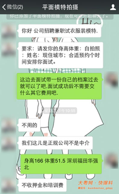 新闻提要 深圳网友小琪向“快曝料”微信号报料称,她近日在招聘网站上看到深圳一些公司招聘兼职模特的信息便投了简历,招聘信息上公司承诺不收取报名费,培训费,押金,结果面试时公司却要求缴纳1900元-2800元不等来制作个人档案相册,而且还不能保证马上入职,小琪觉得自己被坑了。
