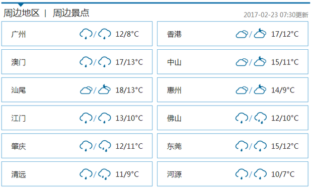 【上班天气】#气温明显下降#预计早晨8-9时,全市阴天,有小雨;气温14-18℃,相对湿度96%-100%;受雨雾天气影响,能见度较低,普遍在1-3公里,路面湿滑,注意行车安全。受冷空气影响,白天气温明显下降,外出记得多穿(带)一件深圳市气象台02月23日08时00分发布。