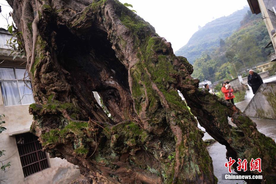 2月22日,空心黄桷树吸引当地居民在此玩耍。重庆市南川区新伍村内的一棵黄桷树被当地居民称为“树坚强”。
