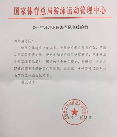 今天上午,一份“关于宁泽涛返回海军队训练的函”的文件曝光,文件内称“宁泽涛因私自代言广告等原因被调整回海军队进行训练”。”