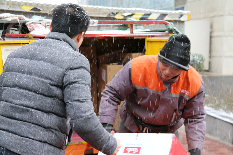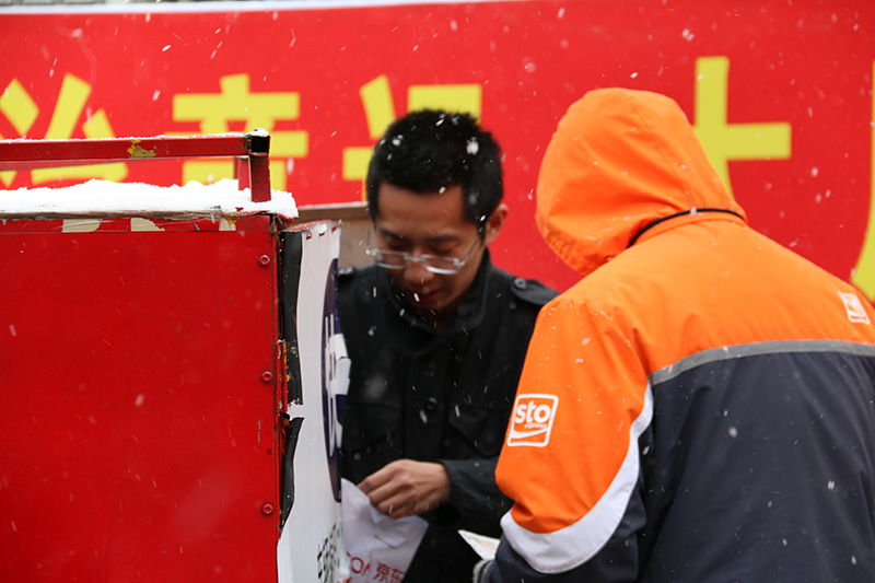 实拍:北京今日(21日)迎来大雪 快递员坚守一线