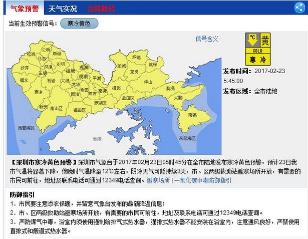 深圳新闻网讯 今年冬天最后一股强冷空气来袭,深圳市气象台2月23日在全市陆地发布寒冷黄色预警,市、区两级救助站避寒场所开放,有需要的市民可前往,地址及联系电话可通过12349电话查询。