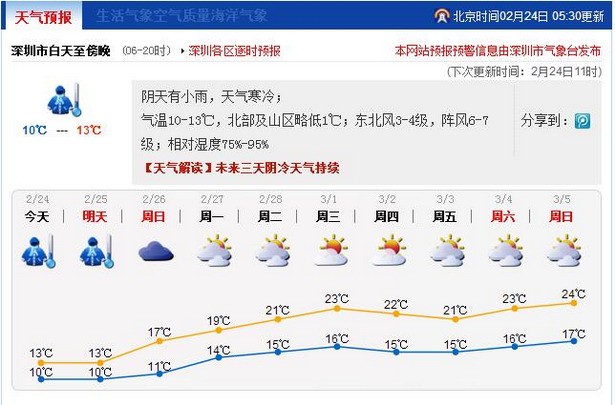 【深圳天气趋势】预计25-26日受冷空气的影响,天气阴冷,体感温度低,并伴有小雨;27日起天空云量减少,可见阳光,气温回升。深圳市气象台02月24日 05:30发布。