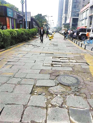 市民所说的润元路,位于福田区车公庙地铁站C出口和D出口南侧,是一条300多米长、双向两车道的支路。记者从西往东走访,发现该道路一部分为水泥路面、一部分为板砖路。其中水泥路多处颜色深浅不一,有明显的修补痕迹,最大的修补带有5米长。板砖路面破损则更为严重,几乎五米一小坑,十米一大坑,不少路段甚至出现下陷。一些下陷处坑洞较深,坑内积水难排,散发阵阵恶臭。记者在现场看到,润元路是车公庙地铁站C、D出口的必经之路,旁边有丰盛町步行街、中国有色大厦、金润大厦、本元大厦、都市阳光名苑等大型商业街及商住小区,是该片区一处十分繁忙的路段,道路破损影响极大。