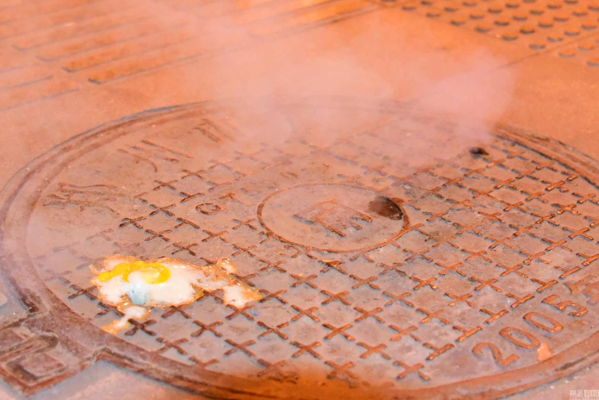 好奇的巡防队员在窨井盖上放置一个鸡蛋,很快就被煮熟了。李四信/视觉中国