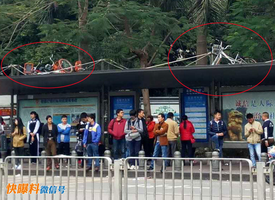 宝安3辆共享单车“飞”到公交站棚顶上(组图)