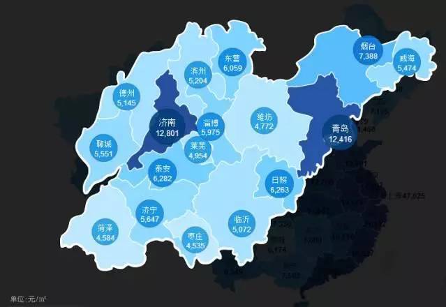 泉城济南和濒海的青岛房价都已破万,分别是全省第一、第二。省内其他城市差距不算太大,房价在4000-6000元/平方米之间,比前两名要便宜一半。