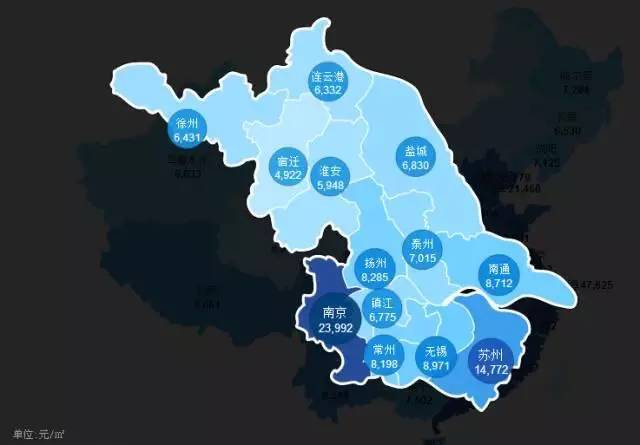 江苏省的南京房价在2.4万元/平方米左右,苏州为1.4万元/平方米,其他城市房价在4000-9000元/平方米之间。南京比苏州贵将近1万,比其他城市房价更是高出3-6倍。