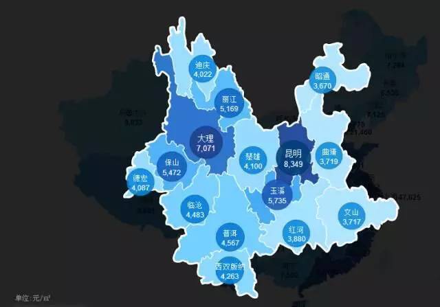 云南房价最高的是昆明8300元/平方米,其次是大理7000元/平方米,其他城市房价在3000-6000元/平方米之间,整体不算很高。