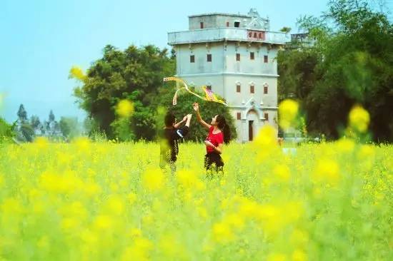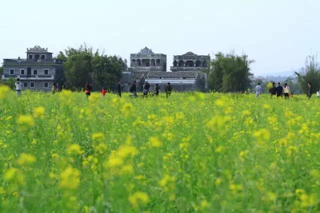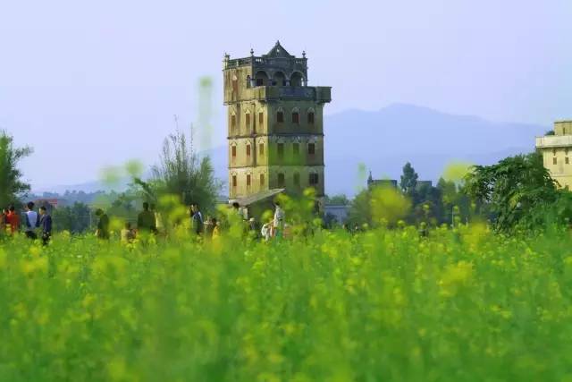 江门开平碉楼群的周围,围绕着大片大片的油菜花。碉楼与油菜花相辉映,成为一道古色古香的风景线。