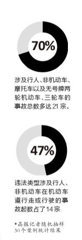 2016年度,10条死亡事故多发道路均为高、快速路,共发生死亡事故107起,造成110人死亡。日前,晶报记者从中以每条道路随机抽取等量案例的方式,获得案例样本30宗。从交通方式角度来看,涉及行人、非机动车、摩托车以及无号牌两轮机动车、三轮车的事故总数多达21宗。另外,违法类型涉及行人、非机动车在机动车道行走或行驶的事故起数占了14宗,而涉及行人的7宗。2016年11月发生于深汕公路的一起事故,不可谓不典型。当日凌晨约00:02,一辆轻型厢式货车沿坪山新区坑梓街道深汕公路由东往西方向行驶至坑梓电子城路段,与由南往北方向横穿公路的一位行人发生碰撞,致行人抢救无效死亡,经责任认定,该行人应承担主要责任。