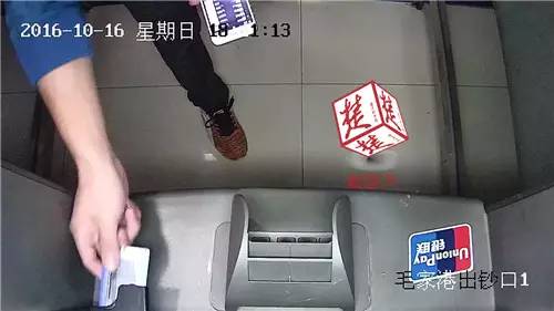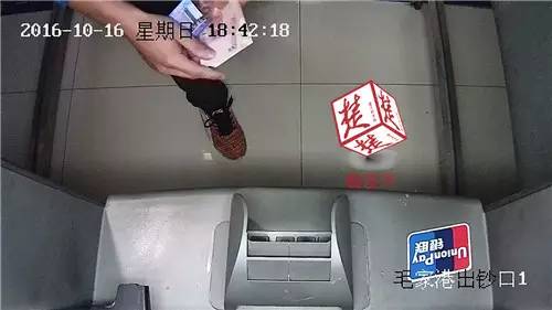 这些人作案时有相当的警惕性:取款时戴帽子遮挡面部,进自助银行后用脚抵住玻璃门,取款时还对着手机说话。