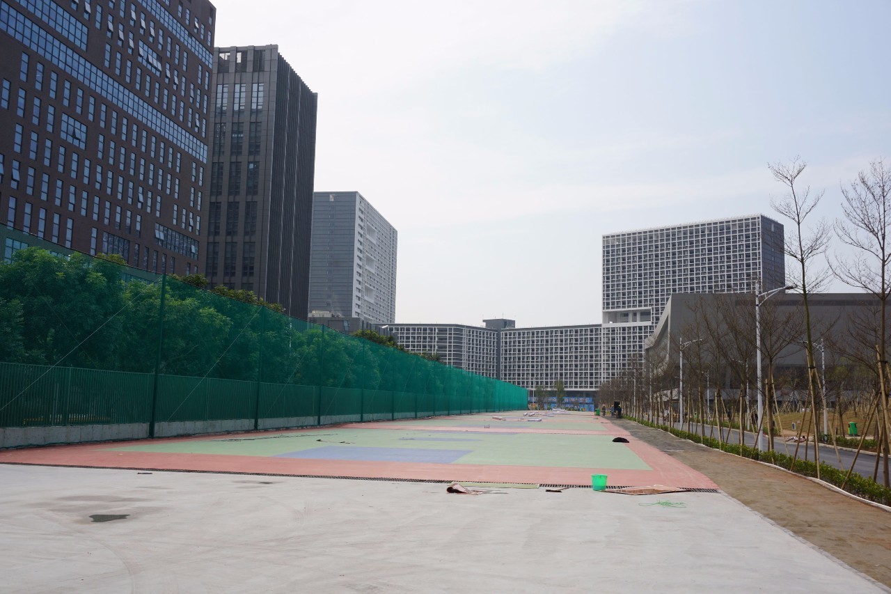 风雨操场旁沿着去宿舍楼的路有一排篮球场,地面已经完工,篮球架应该很快也会到位。