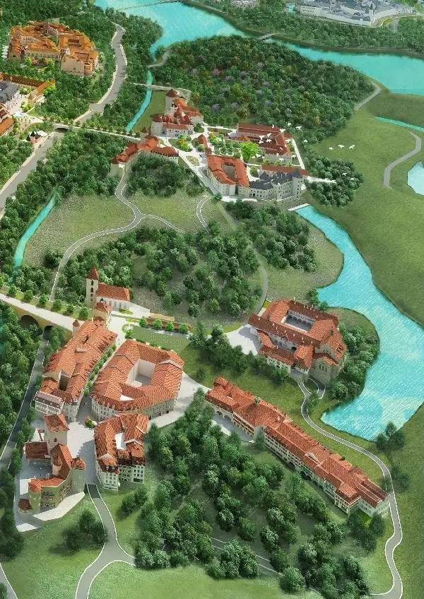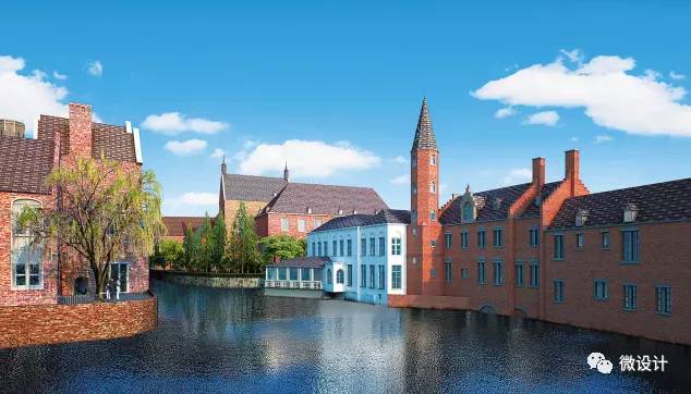 将2至3层建筑布局在基地的低洼部分,4至5层的建筑布置在基地的高地部分,形成“丰富的街路空间”,再现一个童话般的小镇。参考捷克小镇克伦诺夫的城堡、教堂、修道院等大型建筑的建筑特色,整合蜿蜒曲折、壮丽秀美的河流,构成尺度宜人的步行空间。