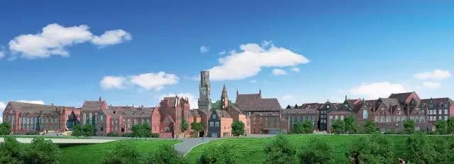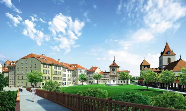 参考比利时著名城市布鲁日连绵小建筑物的街区特点,结合红砖外墙、阶梯式陡坡屋顶等外观特征,以及独具特色的钟塔和拱形石桥设计,形成了与自然环境完美契合的街区空间。